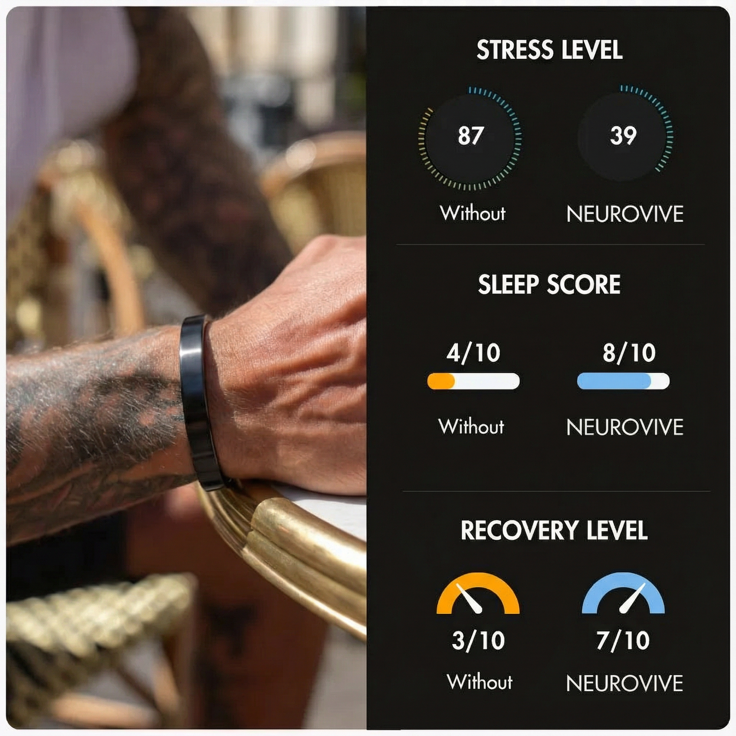 Worn daily, Neurovive™ interacts directly with your body’s internal systems, supporting metabolism, testosterone, focus, and masculine vitality: without flooding your system the way pills or stimulants do.